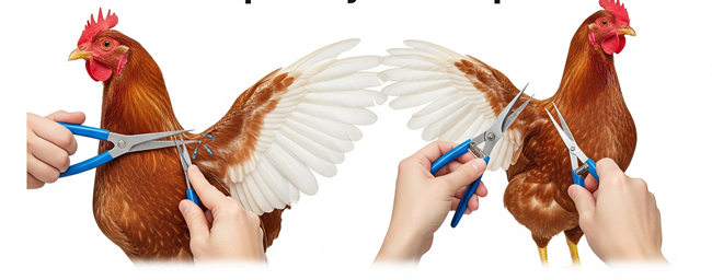 Wing clipping is the most common method of controlling the flight of home-farm chickens. It involves using a sharp pair of scissors to cut off the first ten flight feathers on one wing. This causes a bird to lack the balance needed for flight and in theory discourages them from trying. It is also temporary because it lasts only until new feathers grow during the next molt. This can be a few months in young birds and up to a year for older ones.