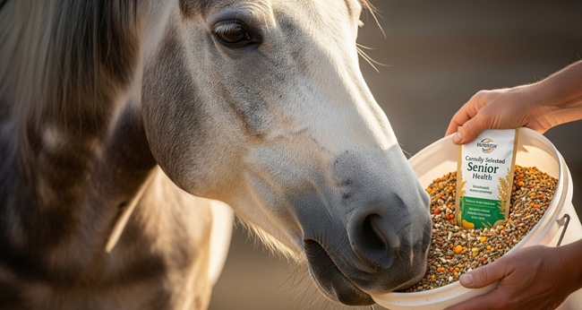 Several feed companies offer extruded grain products formulated specifically for an older horse. These products may prove beneficial to increase the horse’s feed utilization. If a horse cannot chew hay sufficiently, then a complete feed that is high in fiber can be given. Many feeds specially formulated for senior horses are high in fiber and fat and can be fed as a mash, to give the horse all that is nutritionally required.