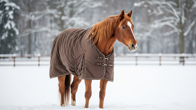 Should you blanket your horse? This answer could be yes or no. The circumstances of each horse help to make up this answer. Clipped horses are not able to create their own blanket of hair so the owner must take the time to blanket the horse as the temperatures change. Older horses whose appetites and digestion may not provide enough fuel to keep their flesh full and their “furnaces” strong require shelter or blanketing during bad weather. What must be considered is the type of weather the horse is subject too. Cold wind causes horses the greatest discomfort and more rapidly drains their energy because it whips away body heat faster than any other condition. Cold rain is a close second, chilling the skin through conduction and flattening of the hairs’ insulating lift. Thirty-five degrees and rain is much harder on a horse than dry weather that is below zero.